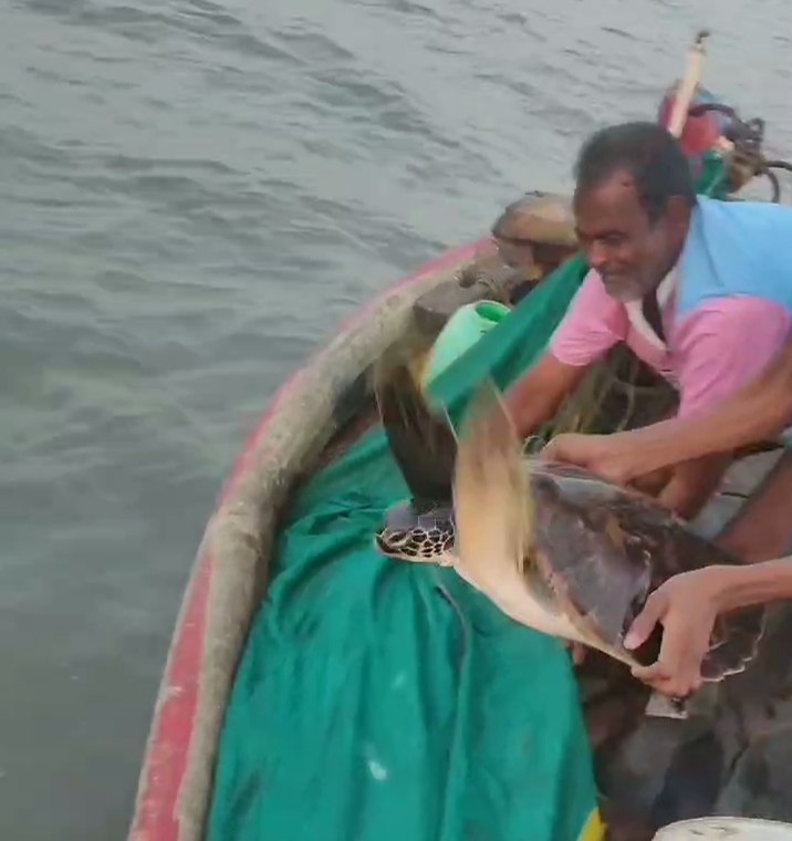 करंजा गावातील कोंढरीपाडा येथील भारत हिराजी पाटील व त्यांचे सहकारी नेहमी प्रमाणे अरबी समुद्रात आपली बोट घेऊन मासेमारी करण्यासाठी गेले होते. त्यानी खोल समुद्रात मासेमारी करणारे जाळे टाकले असता, त्यांच्या जाळ्यात मंगळवारी दि. २६ रोजी समुद्रातील मोठाले कासव अडकून पडले होते.हि बाब भारत हिराजी पाटील व त्यांच्या सहकाऱ्यांच्या निदर्शनास आली असताना,त्यांनी जाळ्यात अडकले कासव बाहेर काढून त्या कासवांना पुन्हा समुद्रात सोडून दिले आहे.